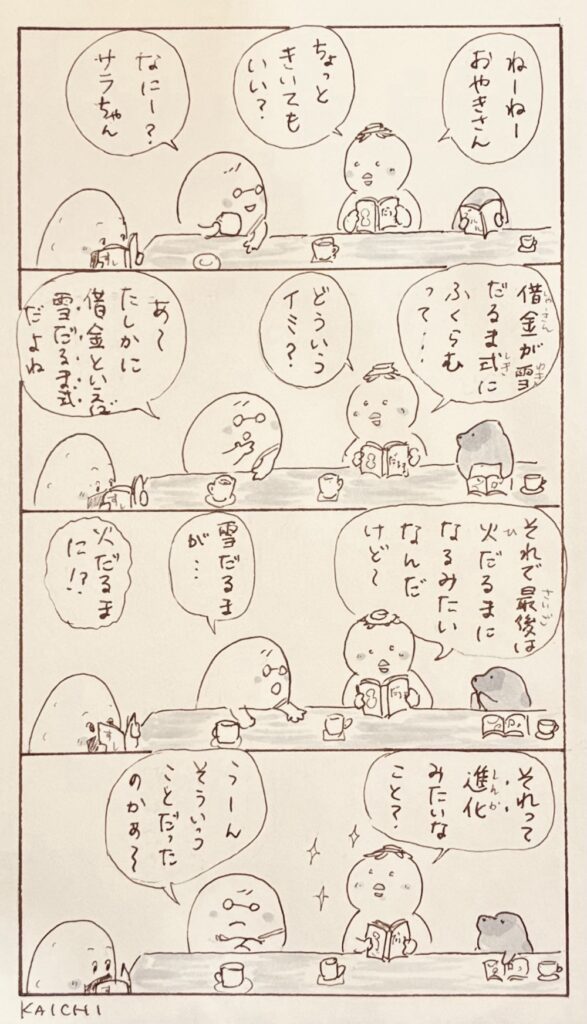 おやきさんのキャリアカウンセリングで旅に出ることを勧められたせんぷうきさんが、旅で出会った仲間たちとオープンしたブックカフェ《Cafeせんぷーき》。喫茶担当の月さんが冬眠してしまい、早速休業していましたが、そろそろ動き出す気配が漂い始めました。