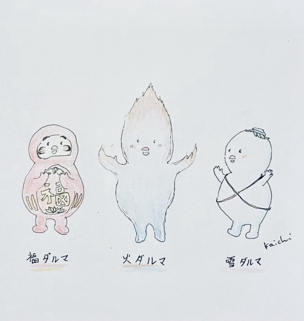 おかきが降るかも、という天気予報を聞き、おかきが降ることを願う唄を歌い、舞い踊るおやきさんとおにぎりさんとカラスさん。
