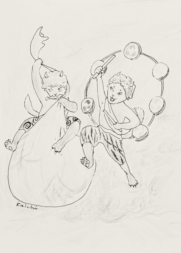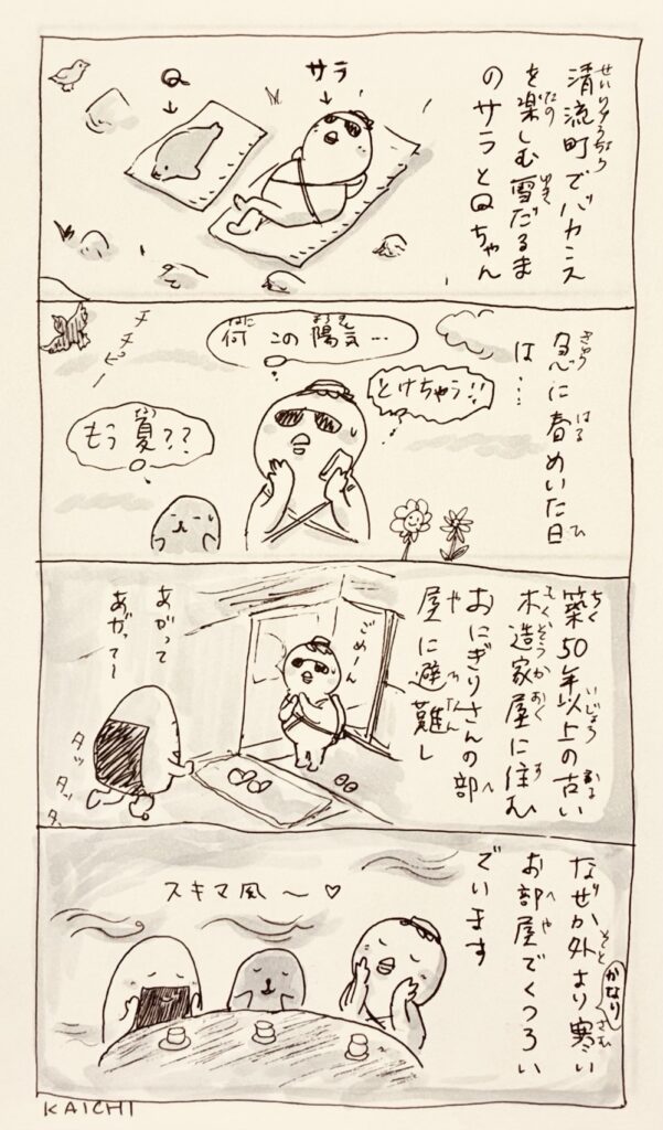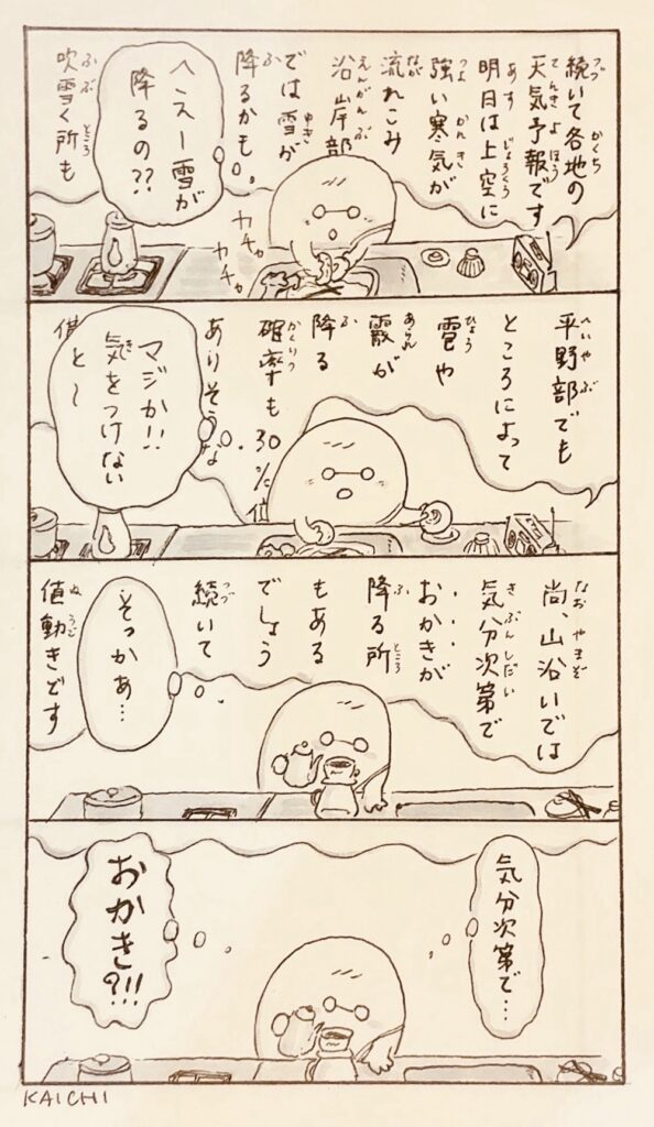 おかきが降るかも、という天気予報を聞き、おかきが降ることを願う唄を歌い、舞い踊るおやきさんとおにぎりさんとカラスさん。