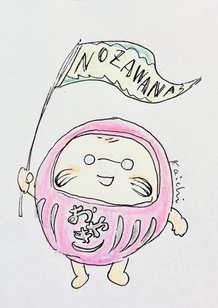 だるまスーツを着て野沢菜の旗を振るおやきさん