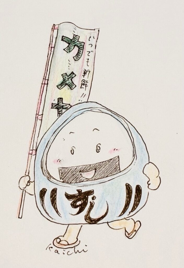だるまスーツを着てスーパーカメヤののぼりを持って走る、寿司になりたいおにぎりさん