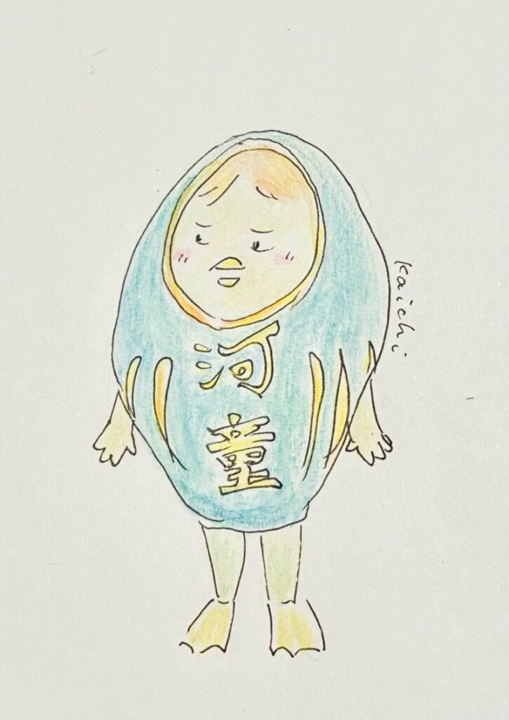 だるまスーツを試着し、戸惑いつつも喜ぶ河童さん 友情出演:清流町のみなさん