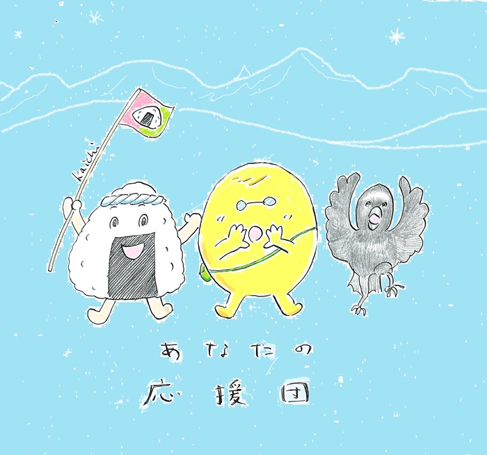 <あなたの応援団> 小さなおにぎりの旗を振る応援団長のおにぎりさん、両手をメガホンにして声援を送るおやきさん、掛け声に合わせてバサッバサッと翼を振るカラスさん
