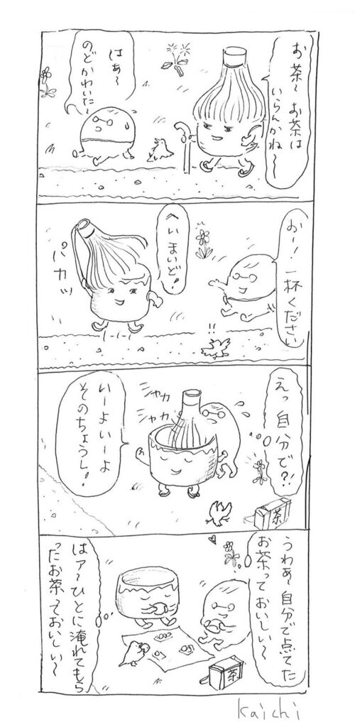 春先としては少しあたたかくなった日の午後3時。お散歩していたおやきさんは汗をかいて道端に腰を下ろしています。そこへ通りかかるのは玉ねぎのような形のお茶屋さん。小さな茶箱を背負い、手には竹製の茶杓の杖を持っています。