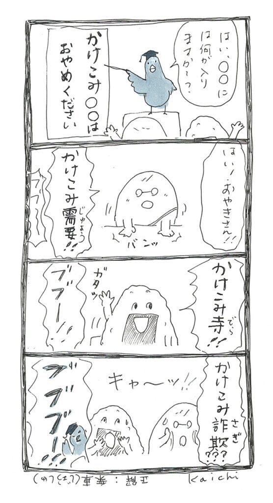 (1) 教壇に立つカラスのカア先生。先生の隣には「かけこみ〇〇はおやめください」と書いた大きな紙が貼られている。指示棒で紙を指しながら、「はい、〇〇には何が入りますか~?」と呼びかけるカア先生。手前にはおやきさんとおにぎりさんの後頭部が並んでおり、二人とも手を挙げている。 (2) カア先生:「はい、おやきさん!」/おやきさん:(バンと両手で机を叩き勢いよく立ち上がり)「かけこみ需要!」/カア先生:「ブブー」 (3) おにぎりさん:(手を挙げながら自信満々の笑顔で立ち上がり)「かけこみ寺!!」/カア先生:「ブブー!!」 (4) おやき・おにぎり:(二人で声を揃えて恐怖におののきながら)「かけこみ詐欺???」「キャ~ッ!」/カア先生:(本日最大の声量で)「ブブブ~~!!!」 おしまい ※正解は「乗車」