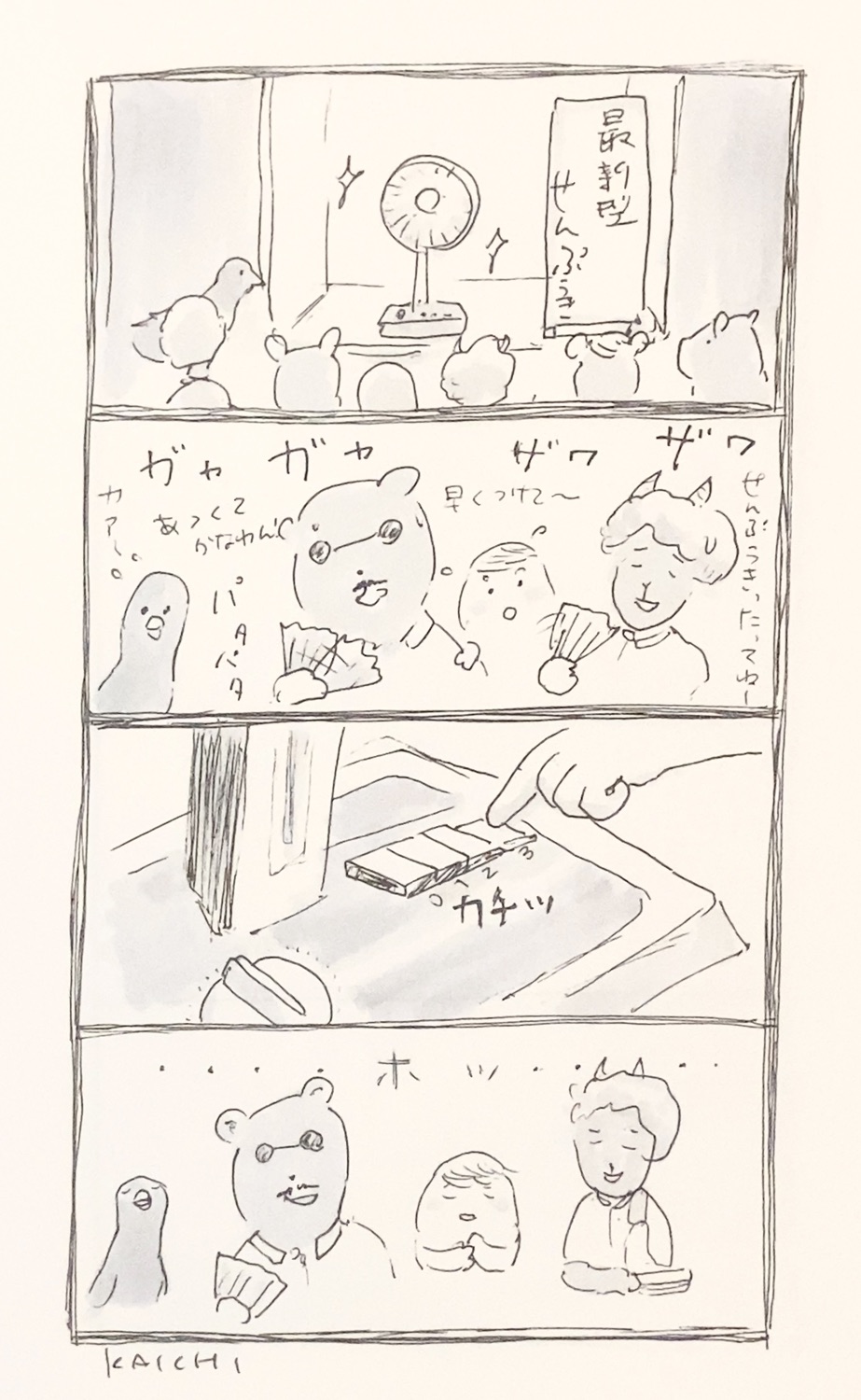 漫画おやきさん vol.3 ありし日の扇風機(回想) 2025-08-21 / なんとなく時代に乗り遅れている気がして、おやきさんのキャリアカウンセリングを受けたせんぷうきさん。「旅に出てみては?」と、意外な提案をされた帰り道、バスの窓から夕暮れの街を眺めながら思い出したのは、初めて扇風機としてデビューしたあの日の風景でした。 vol.2 意外な提案 vol.4 扇風機、旅の道具を手に入れる