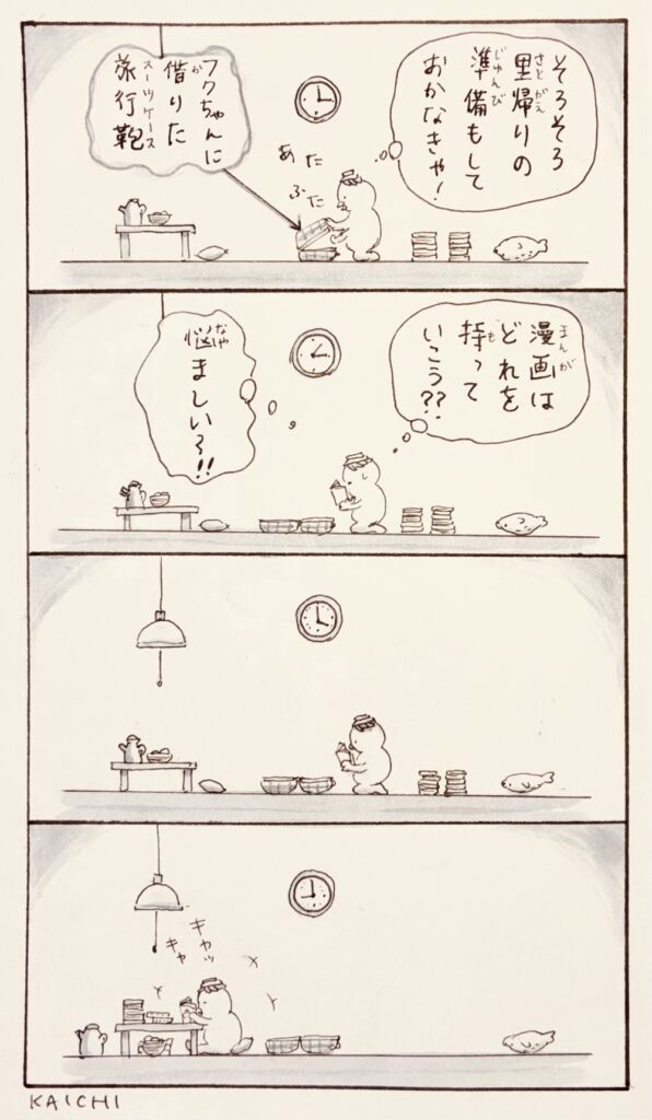 漫画おやきさん パッキングを始めたサラ 2025-12-19 / サラは漫画が大好き ▼解説 フクちゃん(北極の雪工場の同僚)にスーツケースを借り、帰省の準備を始めた雪だるまのサラ。お気に入りの漫画を集め、どれを旅のお供にしようか…、ぱらりとページをめくったが最後、夜更けまで漫画を読みこんでしまいました。本人は全く気づいていないようすで漫画を読みながらキャッキャと笑っています。サラは本当に里帰りできるのでしょうか⁈ オーロラを見上げるサラ パッキングを終えたサラ