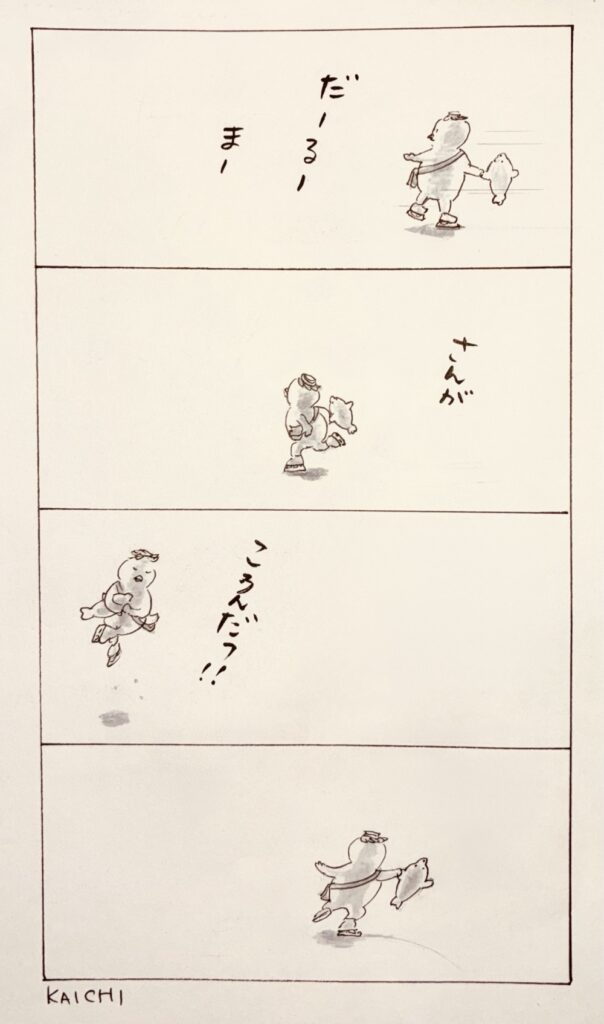 漫画おやきさん 魔法の言葉 2 2025-12-22 / 夢のトリプルアクセル ▼解説 まっしろなスケートリンクで、魔法の言葉“だるまさんがころんだ!”を唱えながら、お気に入りのアザラシのぬいぐるみと一緒に3回転半ジャンプを跳ぶ、雪だるまのサラ。 パッキングを終えたサラ 休日の出来事