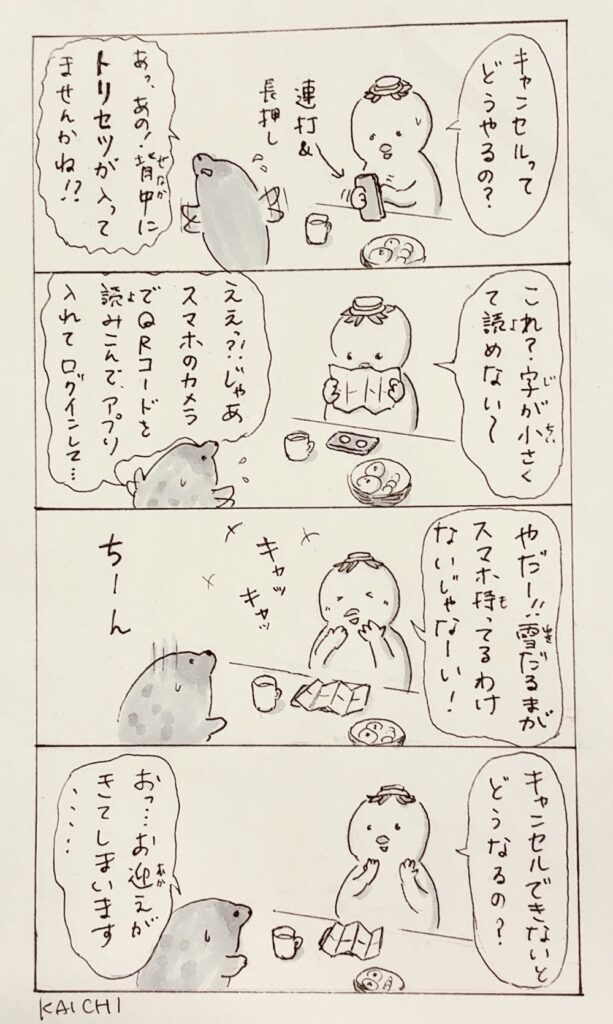漫画おやきさん 背中のトリセツ 2025-12-25 / ▼解説 アザラシのぬいぐるみQちゃんの背中に格納されていたリモコンの赤いボタンを押してしまった雪だるまのサラ。Qちゃんはパニックに!背中に入っていたトリセツはサラには字が小さくて読めないし、トリセツに印刷されたQRコードを読み込もうにもサラは雪だるまだからスマホを持っていないと笑う。ちーん、と暗い雰囲気をただよわせるQちゃん。キャンセルできないと、「お迎え」がきてしまうらしい! つづく 赤いボタン ゆめ交通