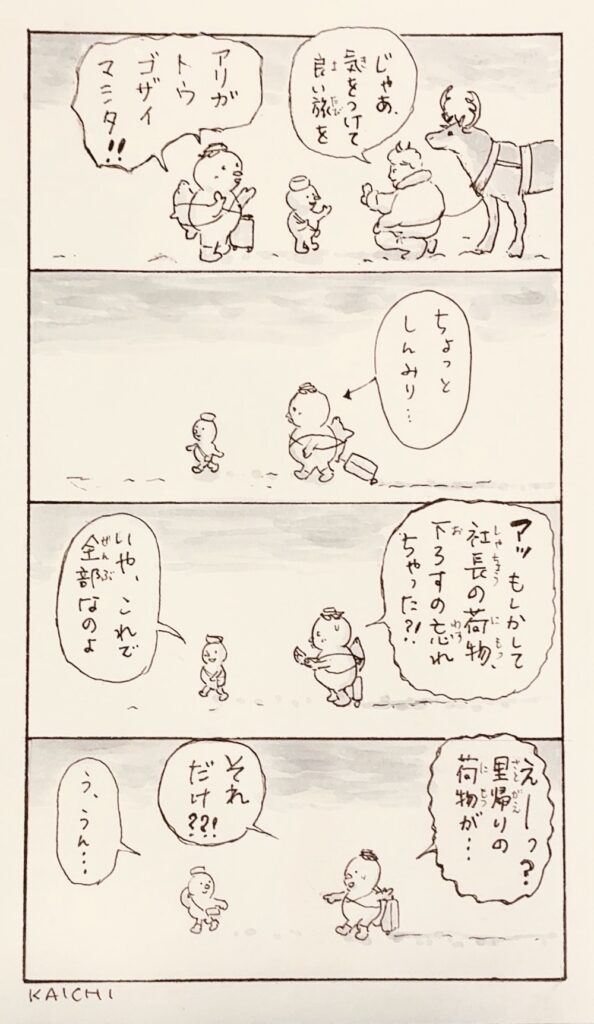 ルーミ:(しゃがんで社長の目線に下がりつつ手を振る)「じゃあ、気をつけて、良い旅を」