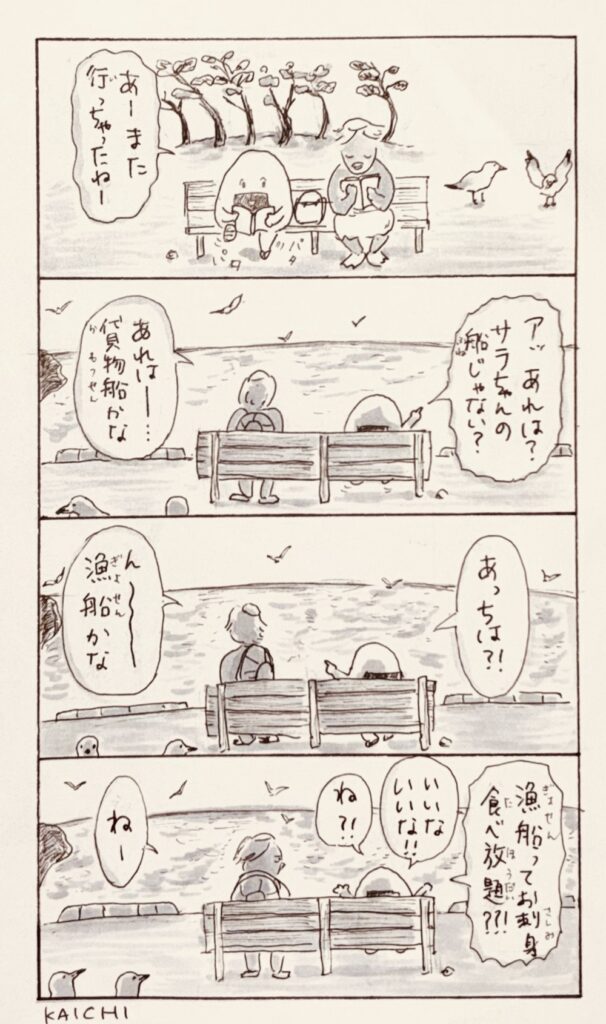 おにぎりさん:(沖を通り過ぎていく船を見て、足をばたつかせながら)「あー、また行っちゃったねー」