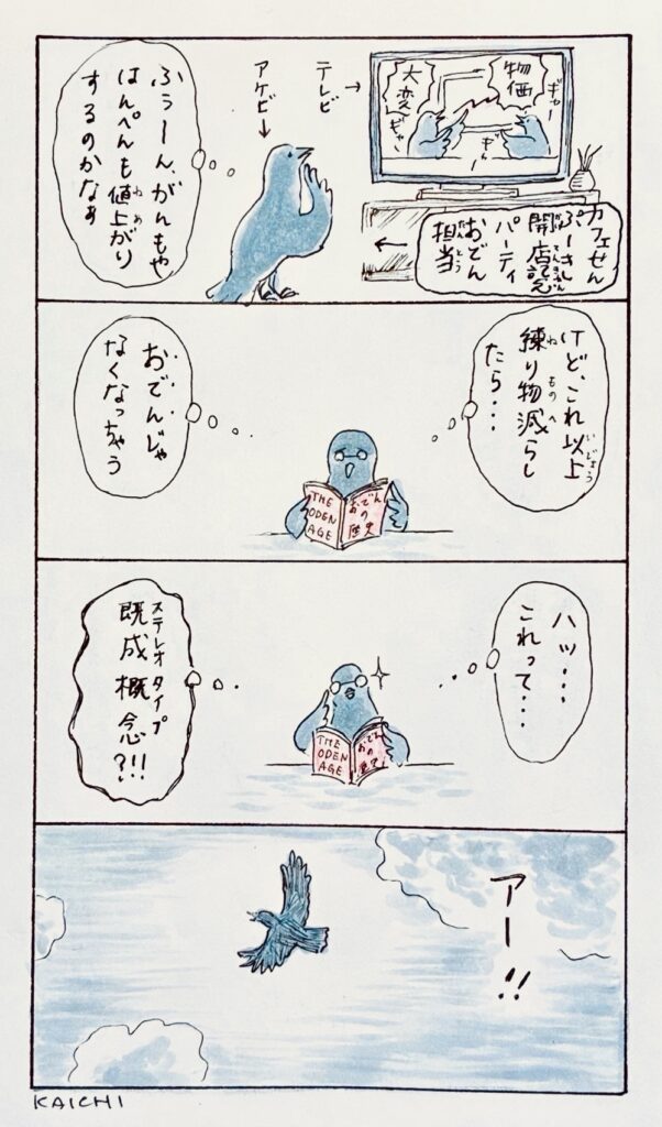 (1)《Cafeせんぷーき開店記念パーティ》でおでん担当を買ってでたカラスのアケビは、物価高でギャーギャー大騒ぎするカラス達をテレビで見ながら、少し不安になりました。