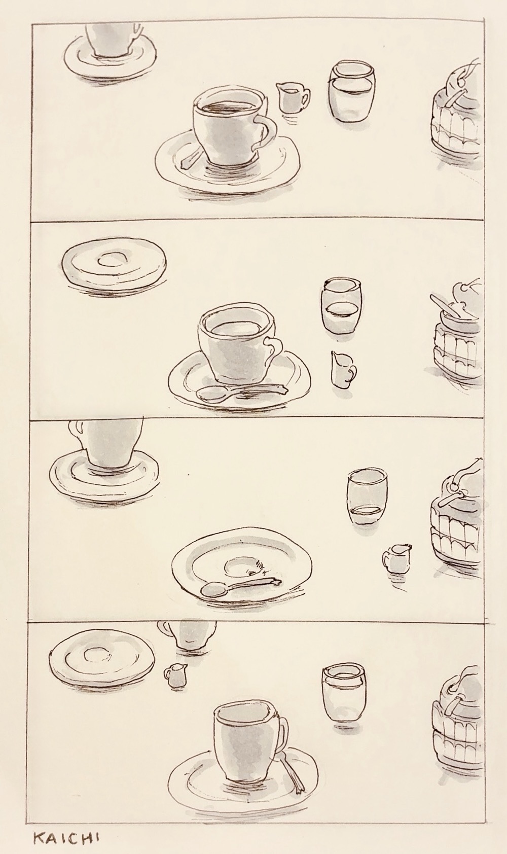 イラスト カフェと時間 2026-04-22 / ▼解説を読む 喫茶店のテーブルの上。ソーサーに載せられたコーヒーカップとスプーン。水の入ったグラス。小さなミルクピッチャー。ガラス製のシュガーポット。時間は喫茶店の景色をこんなふうに少しずつ変えています。 メイクアップ・チュートリアル「基本のだるま」by Oni Hanako だるまファッションのすすめ