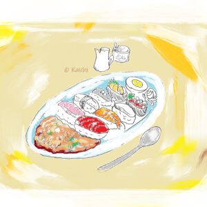 He passes Onigiri-san, who is glued to a sushi photo book, but they don’t notice each other.