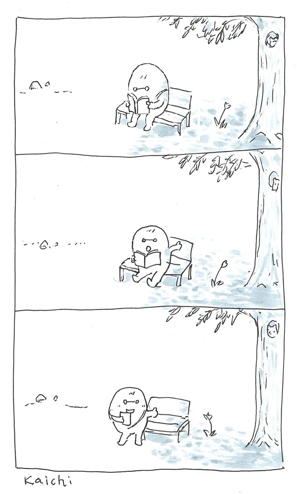 漫画おやきさん ベンチで本を読むおにぎりさんとカラスさん / 2025-05-16 ▼おにぎりさんとカラスさんが読んでいるのは?….What are they reading? Click to read alt text(Japanese/English) ページを開く