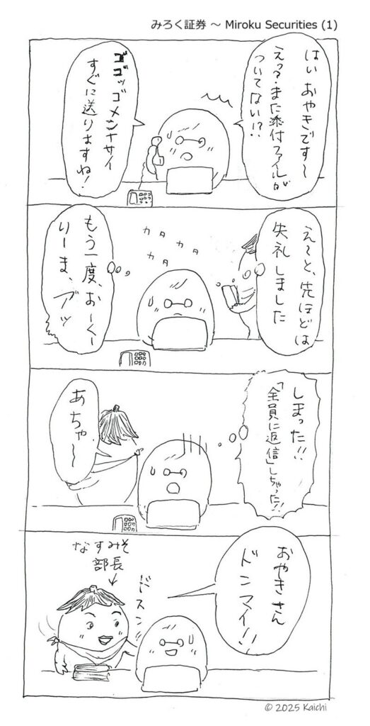 漫画おやきさん みろく証券(16コマ) ~ The Miroku Securities / 2025-04-09 つづき (Full story) ▼ ▼Alt text in Japanese/English ページを開く